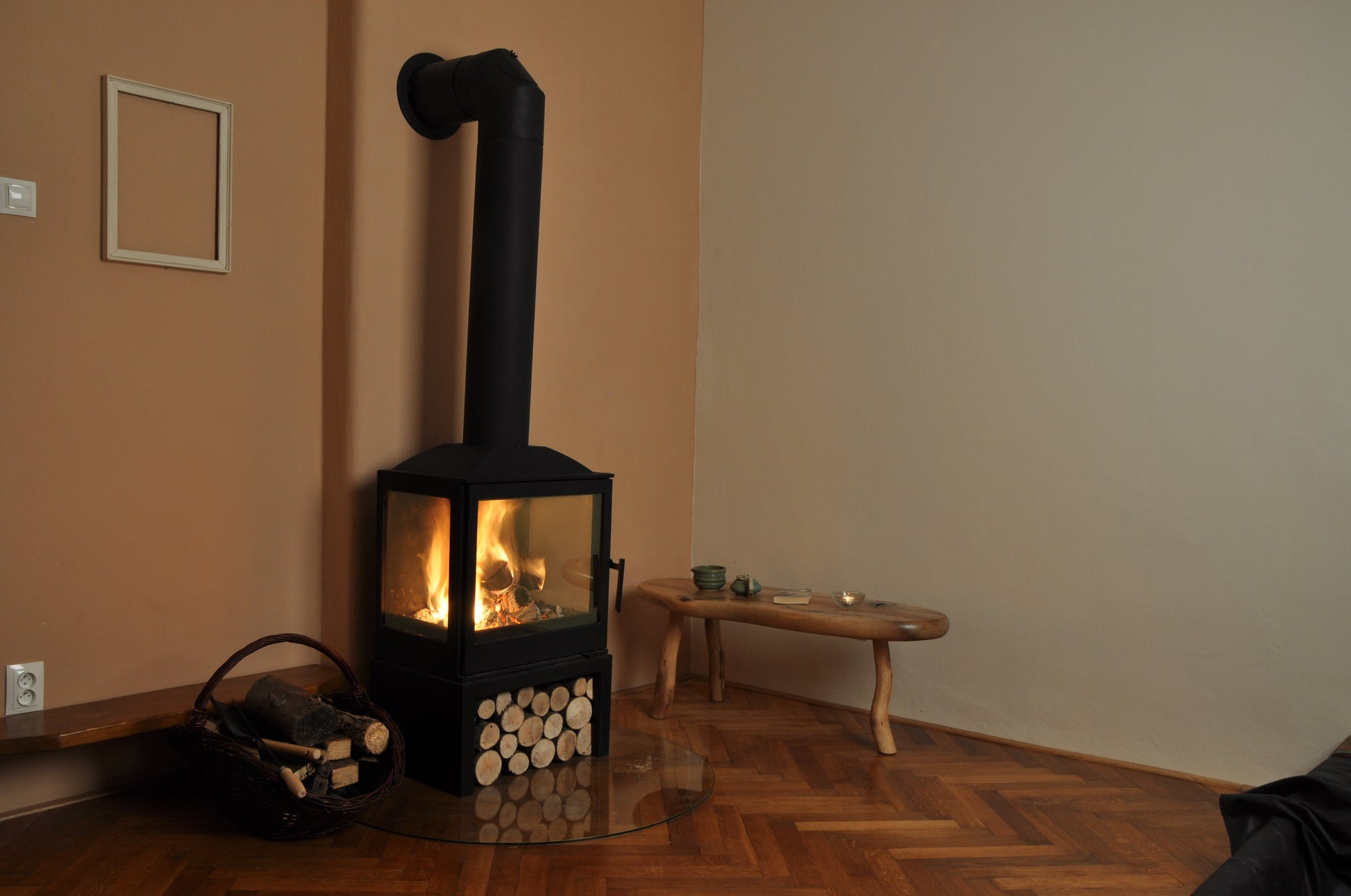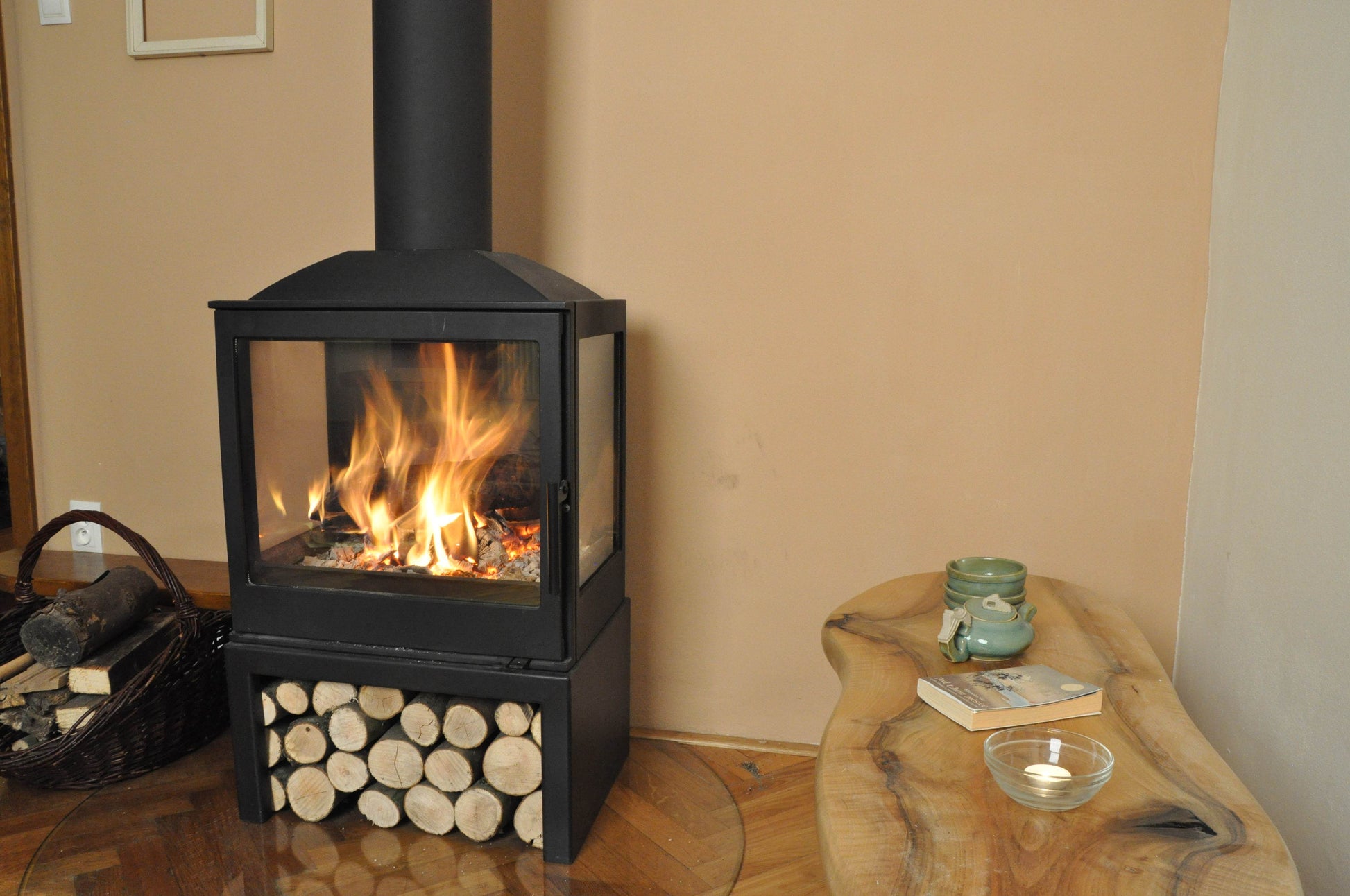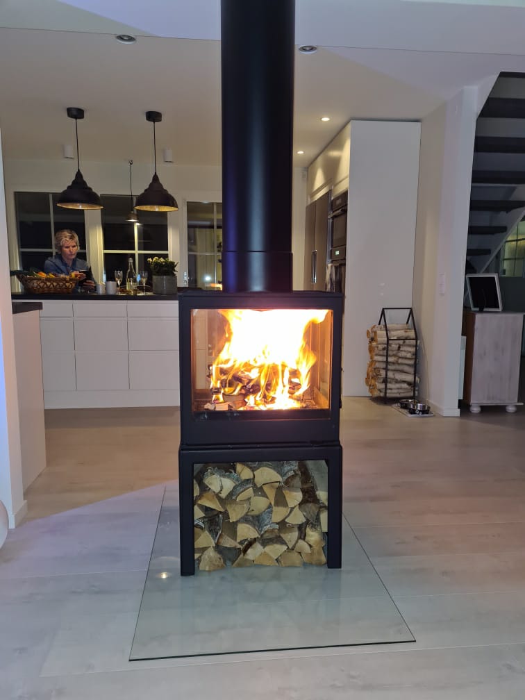 Med sin distinkta form och sina tre glasrutor – ett frontglas och två sidoglas – erbjuder kaminen en panoramavy över lågorna, vilket gör den till hemmets naturliga samlingspunkt.