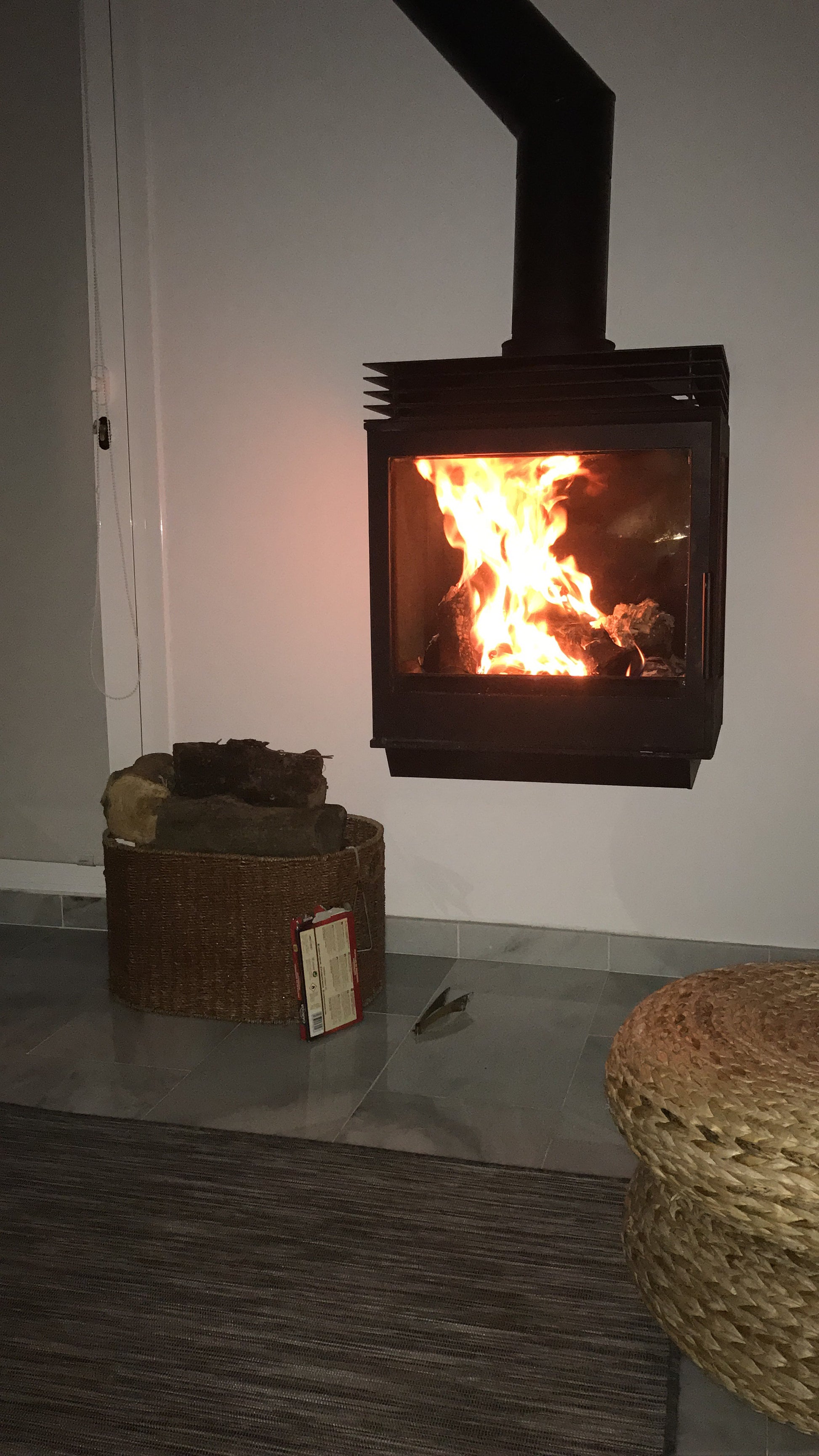 Flammorna syns från flera vinklar och skapar en varm, inbjudande atmosfär som förvandlar vardagsrummet till hemmets hjärta.